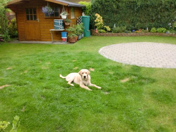 Ich übe mein Haus zu bewachen. Potentielle Einbrecher wehre ich durch Schwanzwedeln ab!