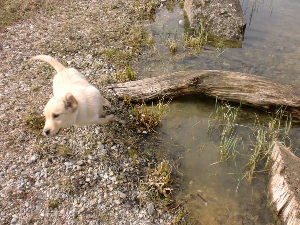 Den ersten Frühlingstag nutzten mein Herrchen und mein Frauchen um mit mir die Hundeschule im Doggenclub zu besuchen. Als echter Retriever verbrachte ich die Pause natürlich im Teich!